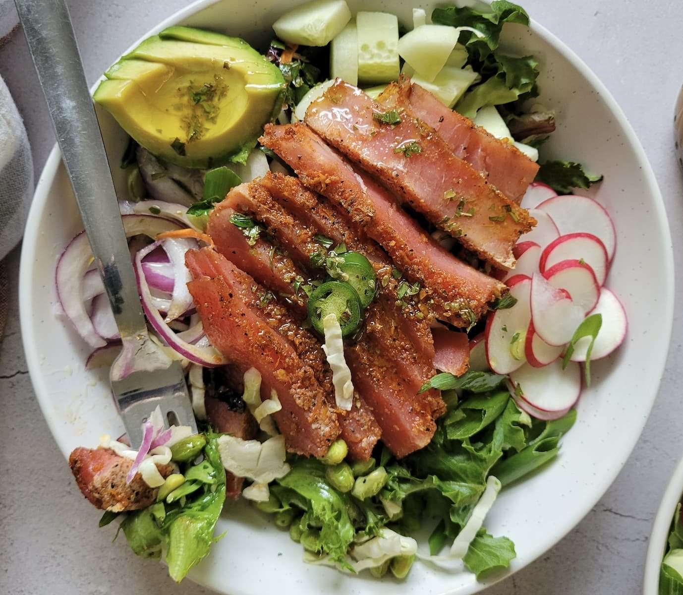 Whether you’re prepping for a quick lunch, a satisfying dinner, or even a show-stopping potluck dish, this Ahi tuna salad is here to save the day. It’s super easy to whip up, with fresh, vibrant ingredients that come together in no time. Just cook your tuna however you wish (grill, sear, air fry, etc.), toss it with the greens and veggies, and drizzle on that tangy citrus vinaigrette. Voila! You’ve got a meal that’s as simple as it is downright delicious.