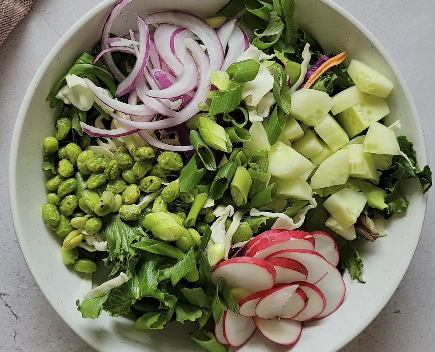 - In a large salad bowl, add the salad greens, coleslaw mix, red onion, cucumber, avocado, scallions, edamame, jalapeño, and radishes. You can leave it like this or gently toss to mix.