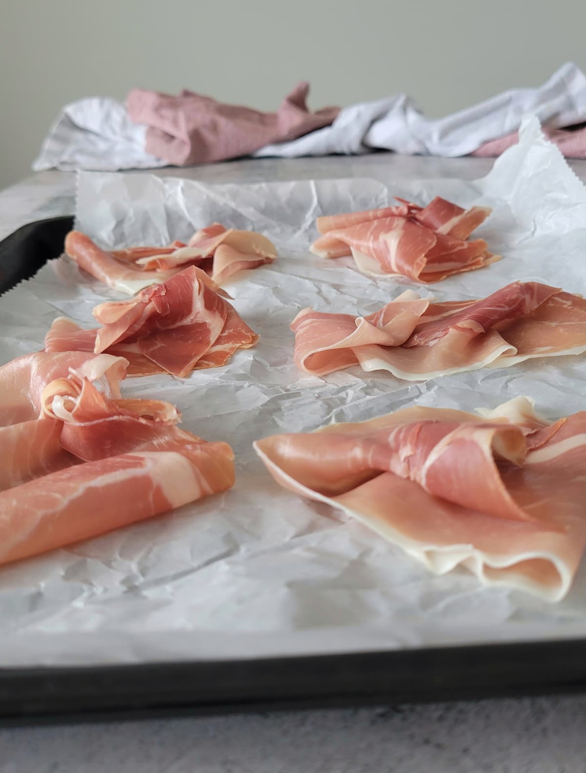 - Lay the prosciutto slices in a single layer—no overlapping!