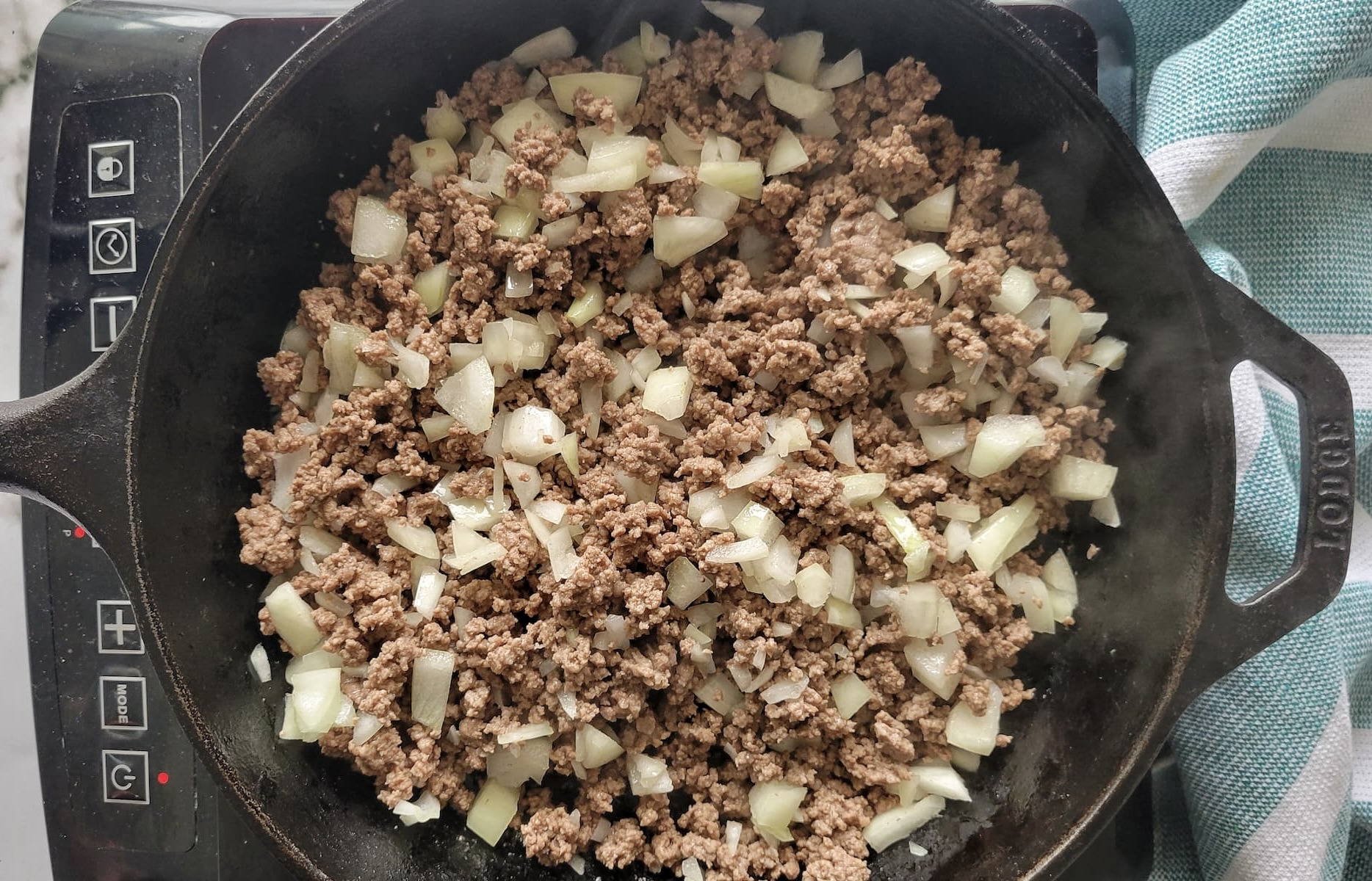 - Add the diced white onion to the skillet with the beef. Sauté for 3-4 minutes, until the onions are soft.
