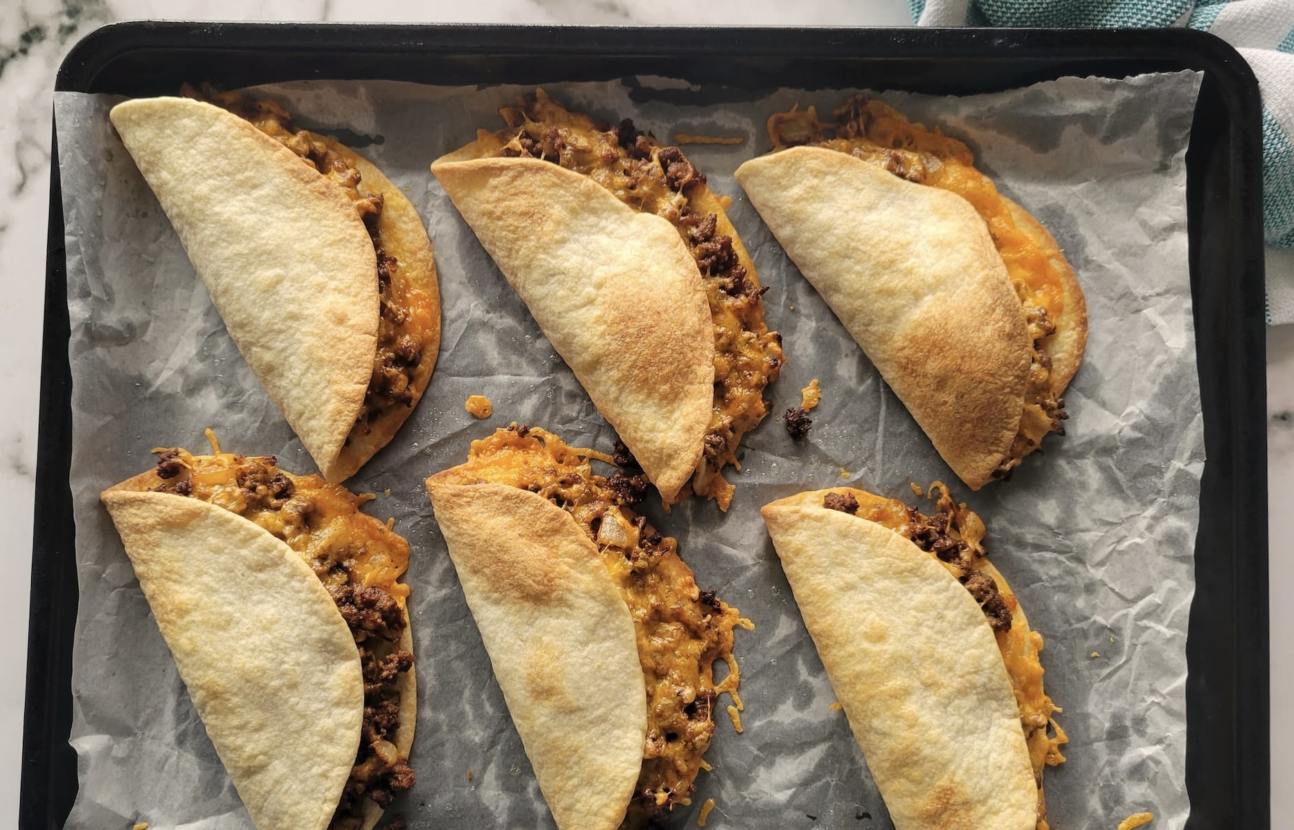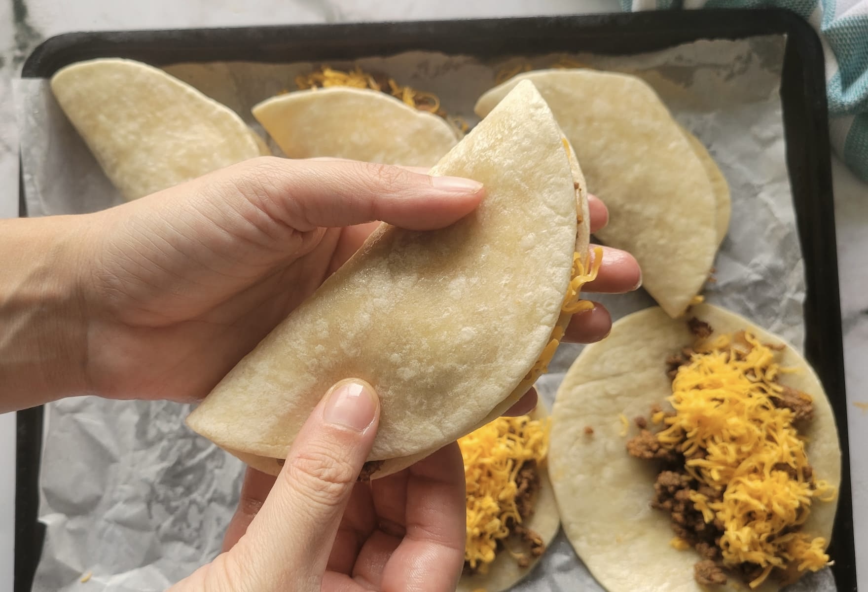 - Press the tacos firmly before baking. Once you fold the tacos, press them down gently but firmly to help seal them shut. This ensures the filling stays inside while baking and helps the tortillas crisp up evenly. EXTRA TIP: If they start to pop open, you can place a baking sheet or another pan on top for the first few minutes of baking to keep them in place.