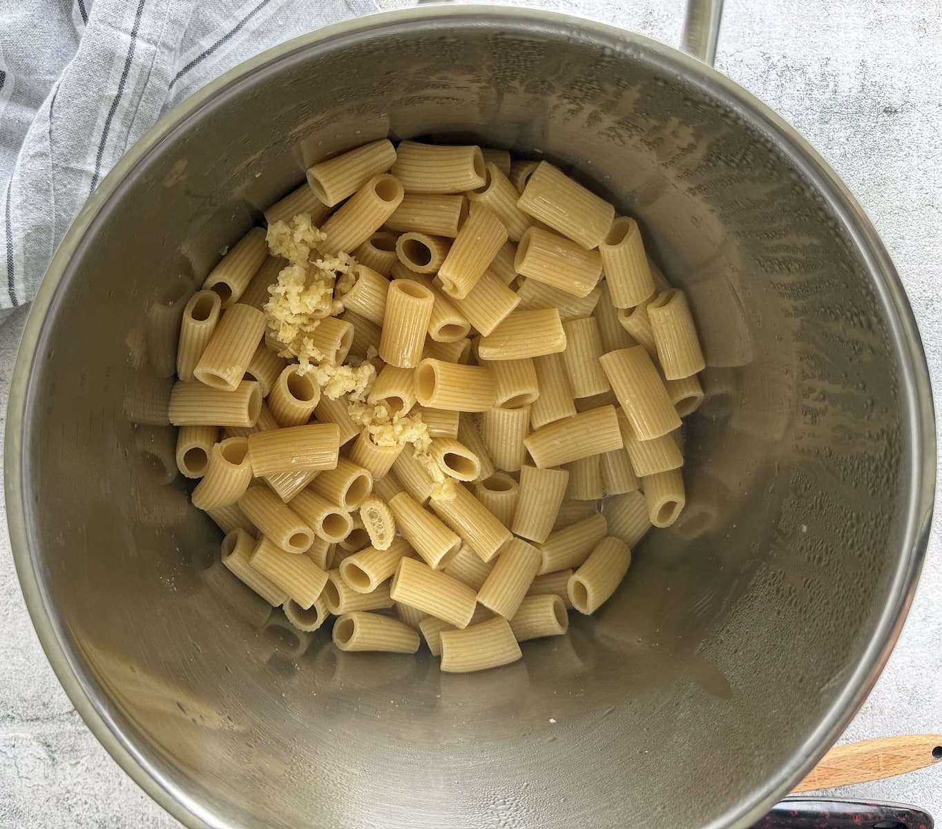 - Add the olive oil and garlic directly to the pot with the pasta. Cook over medium-low heat, stirring constantly, for about 30–60 seconds until the garlic is fragrant.